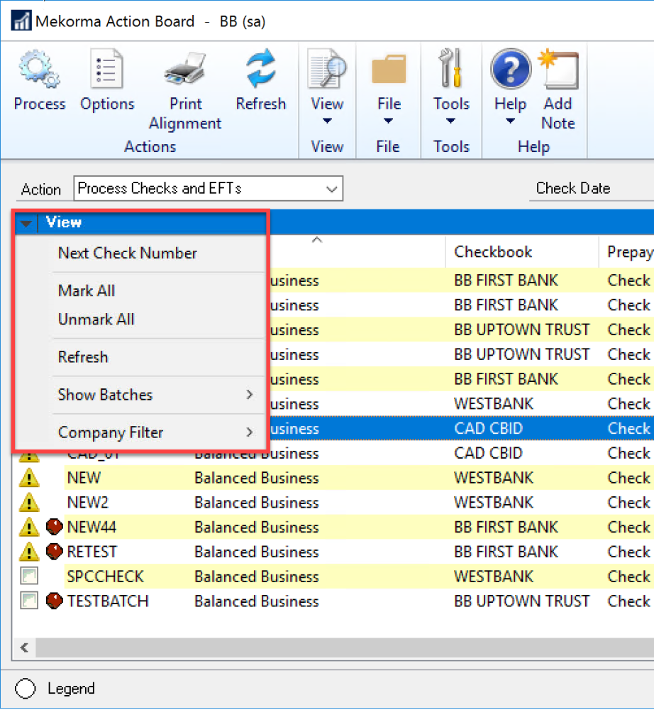 | Mark All | Marks all of the batches in the Mekorma Action Board. |
