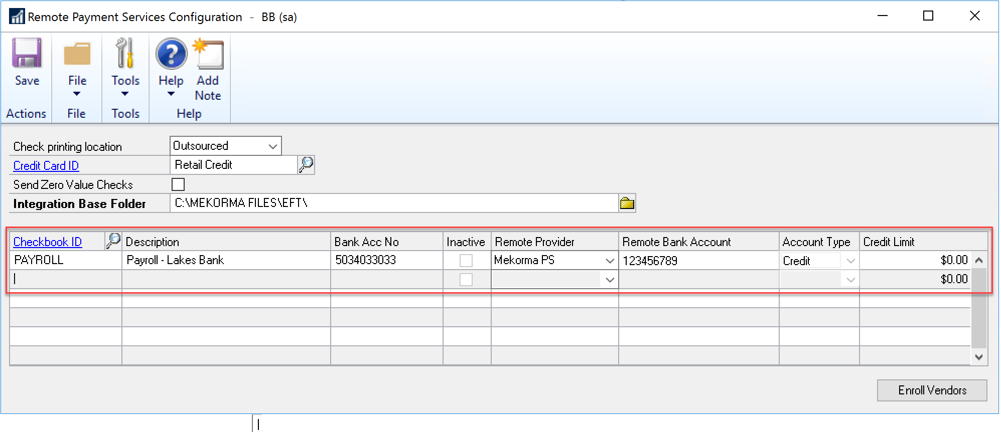Step 2: Add the Checkbook in the Remote Payment Services Configuration window (Mekorma Area Page > Setup > Purchasing > Remote Payment Services Configuration.)