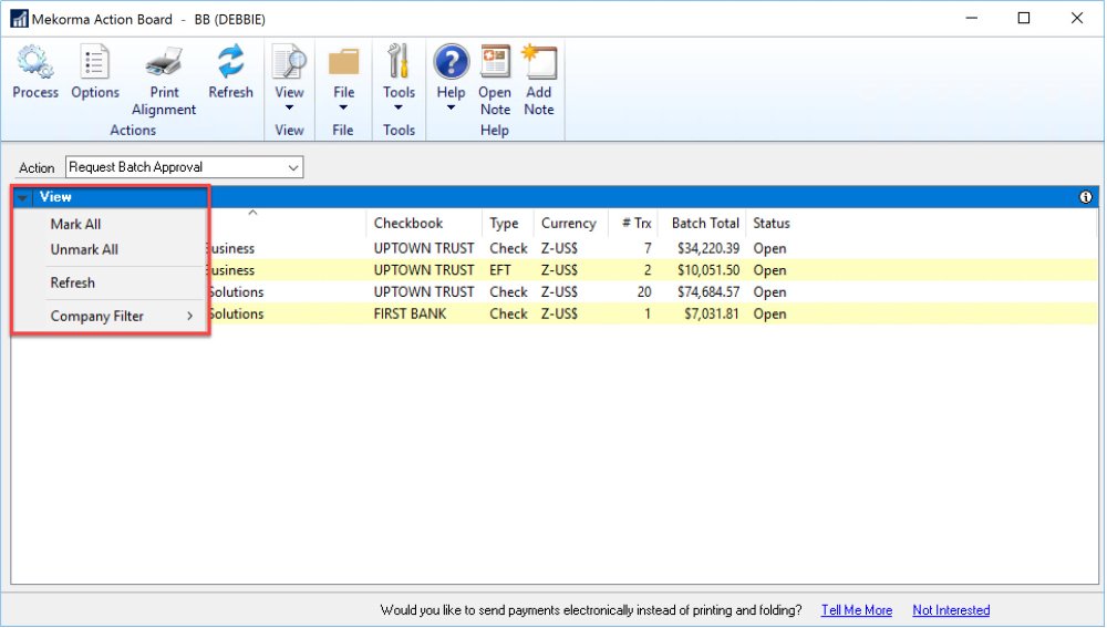 - Open the Mekorma Action Board (Mekorma Area Page > Transactions > Payables > Mekorma Action Board).