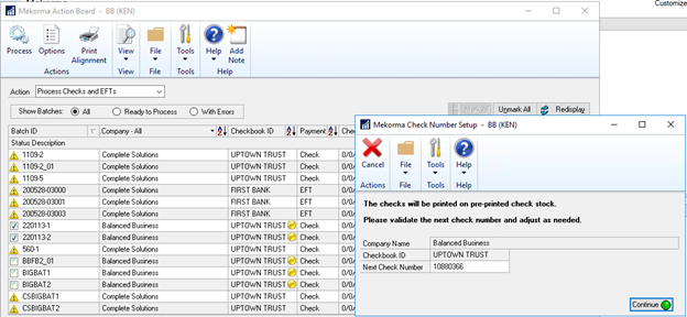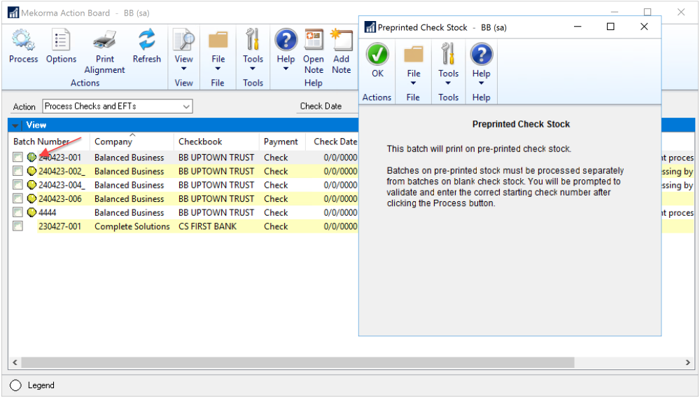 When using pre-printed check stock, only batches from the same checking account may be printed together in order to keep the check number synchronized between Dynamics GP and the check stock. These special rules apply to the batch selection on the Action Board: