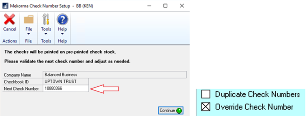 Note that in Check Number Setup, the next check number cannot be changed unless the Override Check Number option is selected on the GP Checkbook Maintenance window for that checkbook.