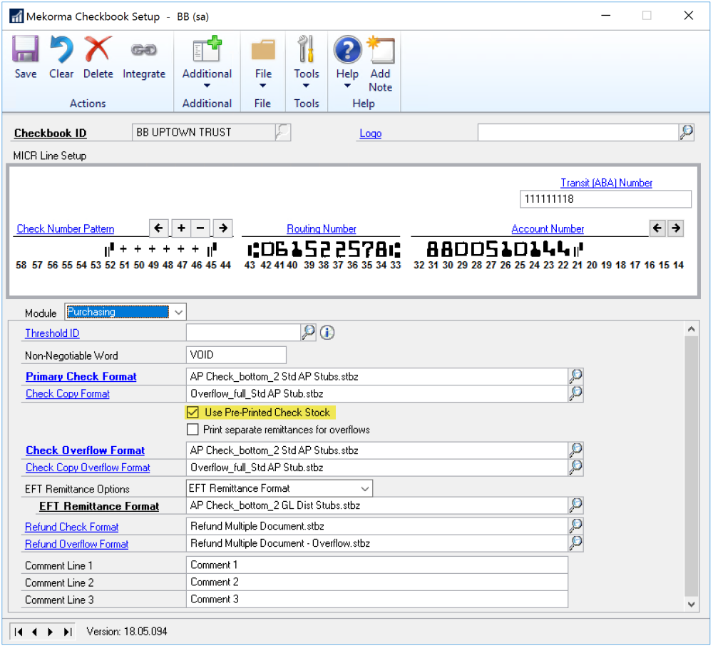 To use this feature for one or more companies, enable the Use Pre-Printed Check Stock setting in the Mekorma Checkbook Setup window, and do not check Print separate remittances for overflows. You cannot used pre-printed check stock in Action Board when Print separate remittances for overflows is enabled.