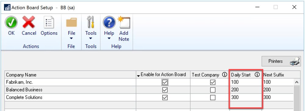 - Add the desired suffix in the column labeled Daily Start for every company you want to differentiate. In our example, Fabrikam’s batch suffix was set to 100, Balanced Business is 200, and Complete Solutions is 300. If you have 36 companies or less, we recommend just using the most significant digit like we have done in this example, going from 100, 200, … to A00, B00, … Z00.