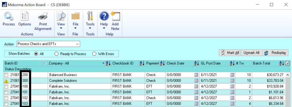 However, if you have more than 36 companies, you will want to use 2 digits such as 050, 100, 150, etc. The third digit will be used to name the batch from within the company. This second example double the number of company starting points to 72 and leaves up to 50 unique batches per day per company before there is a duplicate batch name. Most of the time in a large multi-company situation, only a handful of batches are created each day and this naming convention supplies ample room for unique names.