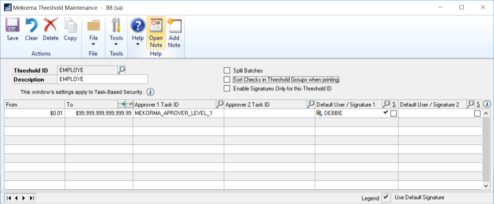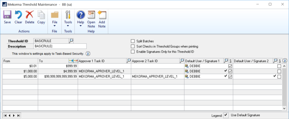 Advanced Approval Workflows use a combination of Checkbook Threshold ID and Vendor Class Security Threshold ID to designate powerful rule variations. In some cases, this will save work for the Approvers when certain payments can be automatically approved. In other cases, this can tighten controls when certain payments need extra levels of protection.