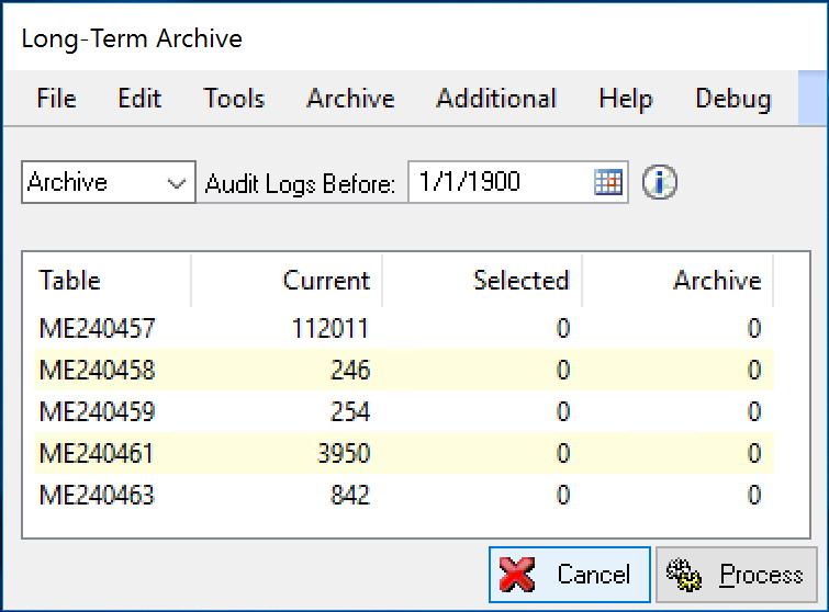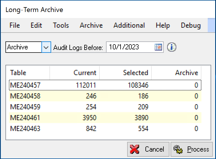 - Select a date in the Audit Logs Before field. The date that is used to select records is the Post Date (POSTEDDT) field in ME240459. When you tab off of this field, the table will display or redisplay the data that will be archived or deleted.