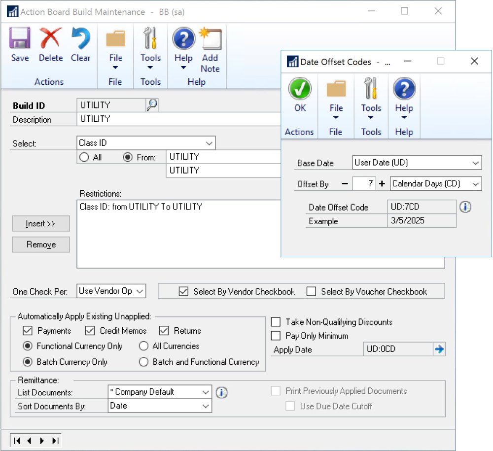 - The Action Board builds using Dynamics GP’s Build Payment Batch window and the selections mimic that window. Select build criteria using any of these options from the Select drop-down menu. Multiple selections can be inserted: