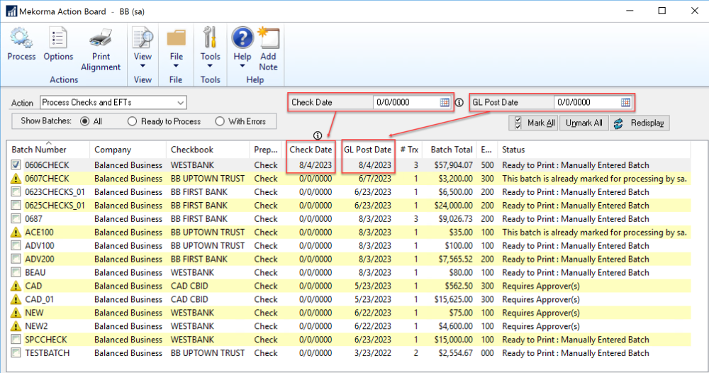 You can easily change the check date or General Ledger posting date for transactions in a batch when you are in the Action Board window.