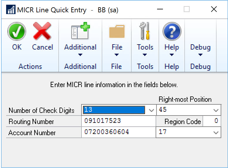 Note that this MICR line setup is based on the Checkbook, so it is set up the same way whether you are using Mekorma Payment Hub for your AP, US Payroll and Canadian Payroll checkbooks: