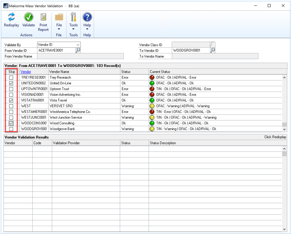 In the Mekorma Mass Vendor Validation window (Mekorma > Routines > Payables > Mass Vendor Validation), check the Skip box for each vendor you want to exclude from the validation check.
