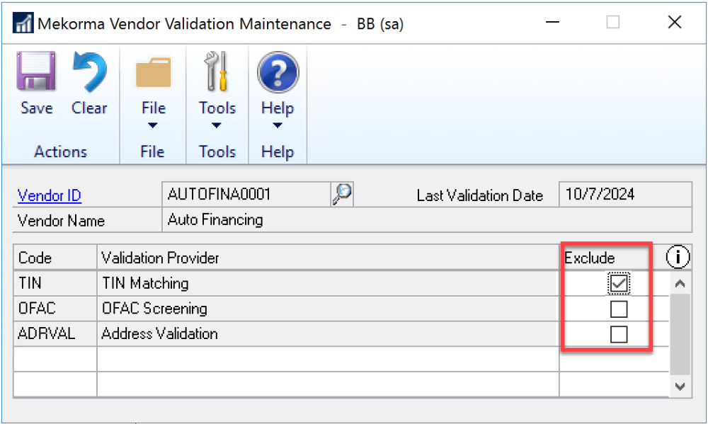 In the Mekorma Vendor Validation Maintenance window (Mekorma > Cards > Payables > Vendor > Additional > Vendor Validation Maintenance), check the Exclude box for each provider to exclude the vendor from validation checks. Always use due diligence when this feature is active.