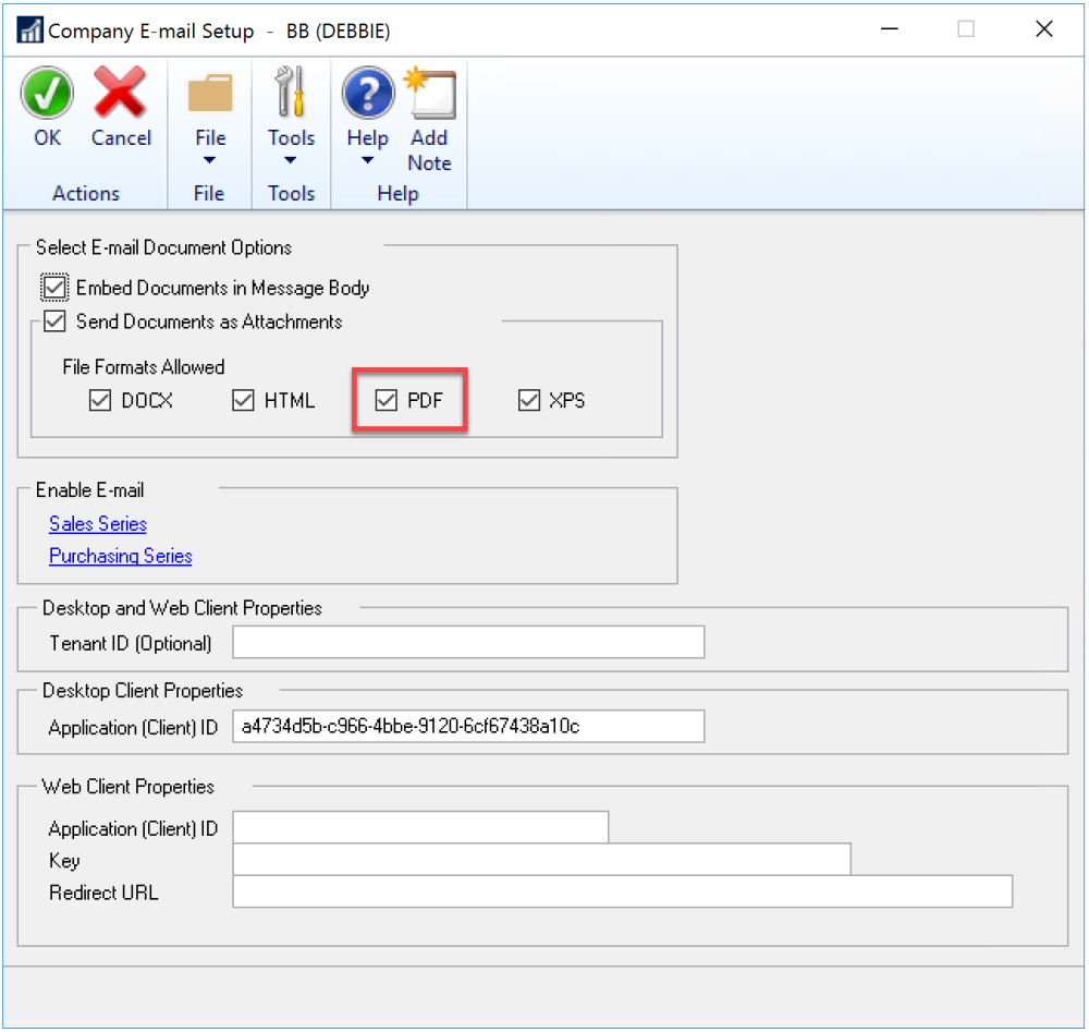 - In the GP Company E-mail Setup window (Microsoft Dynamics GP > Tools > Setup > Company > E-mail Settings), check the box labeled PDF, so Mekorma can generate EFT files.