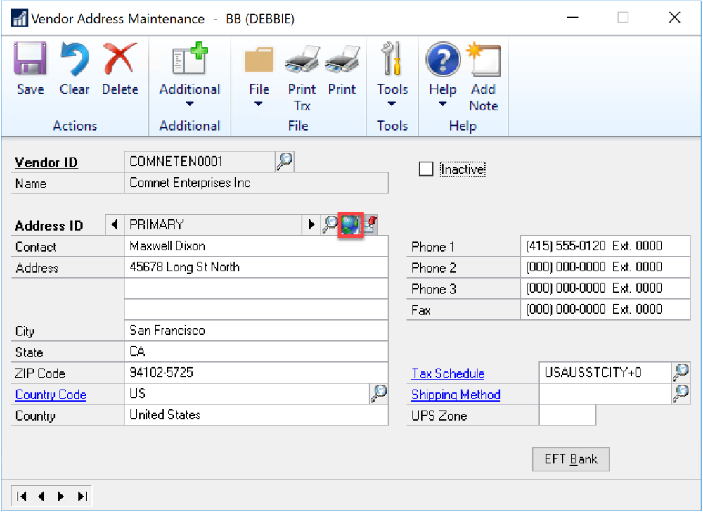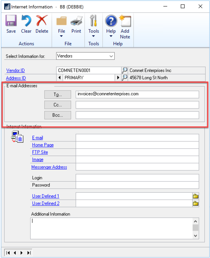 - In the Internet Information window (Microsoft Dynamics GP > Purchasing > Cards > Vendor > click Internet icon), for each vendor who accepts EFT payments, enter the appropriate email address so the system knows where to send your EFT remittances.