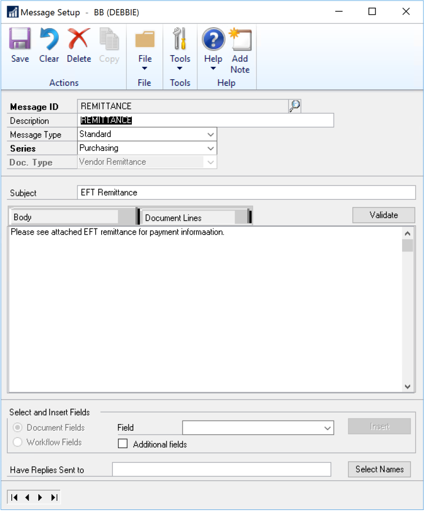 - In the GP Message Setup window (Microsoft Dynamics GP > Tools > Setup > Company > E-mail Message Setup), create a remittance message ID. The EFT file is attached to this message when sent.