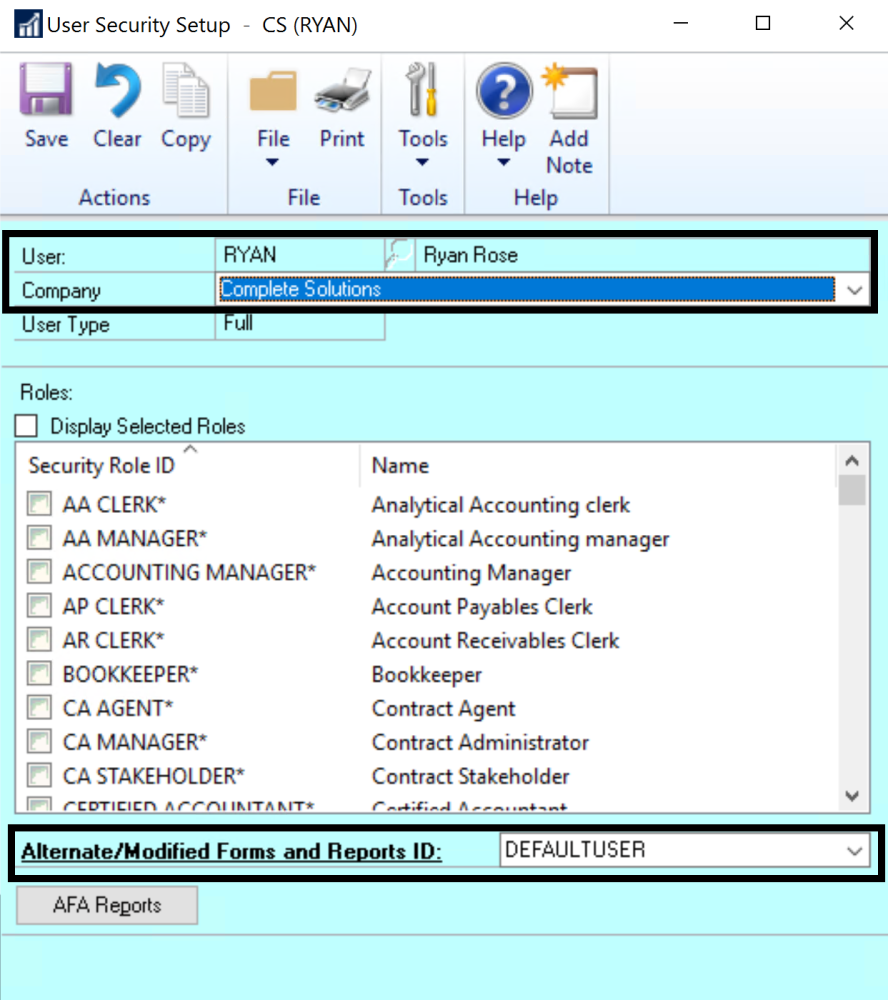 The second step is to assign the Alternate/Modified Forms and Reports ID to each of your Payables and Payroll Users