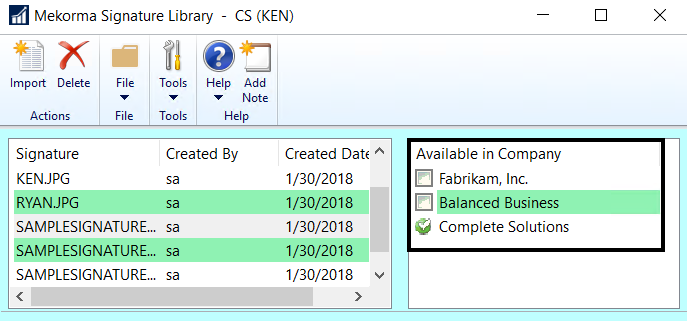 - Signature files can then be assigned to one or more companies. In the Available in Company section of the Signature Library window, simply check the box next to each company that the signature will be used for.