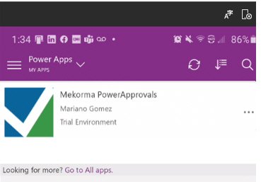 For the approver user on the go, Power Apps offers a mobile client app which acts as a container for shared Power Apps apps. Mekorma Power Approvals runs within the context of the Power Apps mobile client. Each approver user must install the Power Apps mobile client in order to be able to access Power Approvals from their mobile devices.