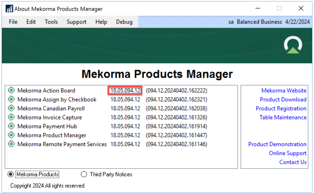 The Products Manager window will tell you what version of Mekorma you are running. You will need this information in the event you need to open a case with Mekorma Support.