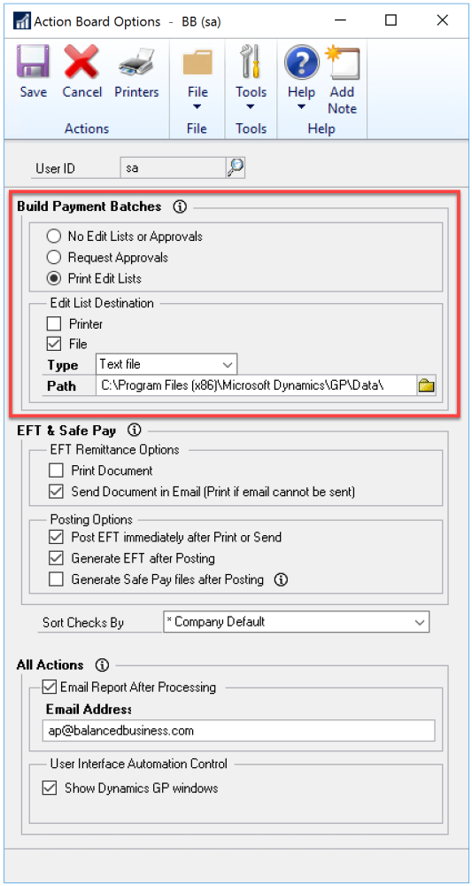 When building payment batches using the Action Board, you have the choice to automate approval requests, print edit lists, or disable those options.