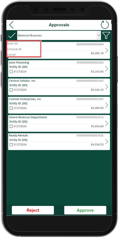 You can select multiple payments, or click the Checkmark icon to select Mark All or Unmark All to reject or approve as needed.