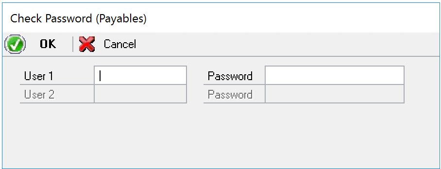 - Depending on the threshold ID and the amount of the check, the Check Password (Payables) window might open. An approver’s GP user ID and password will need to be entered to continue printing the check. If the user printing the check does not have access or the credentials, an approver will need to be at the same computer as the check is being created at to enter the password information.