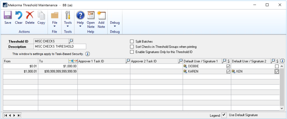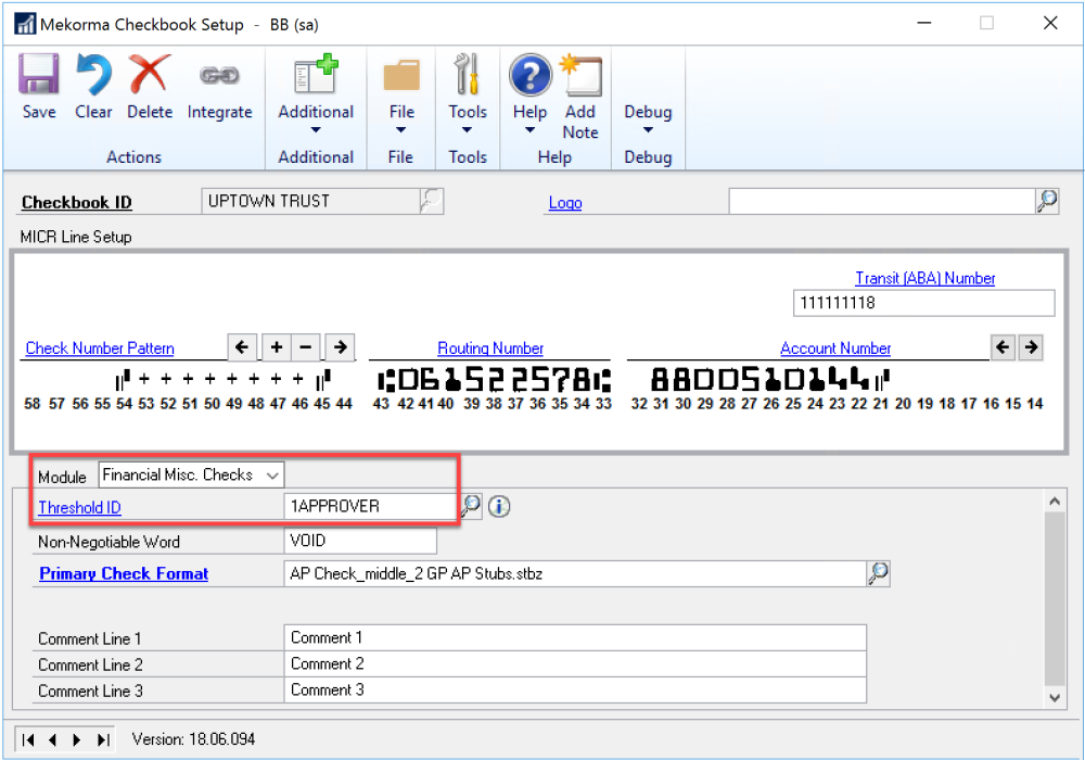 - Assign the threshold ID to the checkbook ID for the Financial Misc. Checks module.