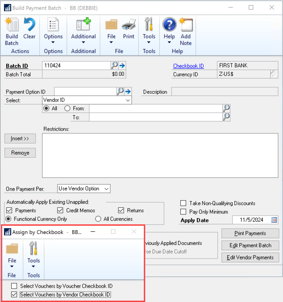Once a checkbook has been assigned to a vendor, you can build check batches using the Assign by Checkbooks feature in the Build Payment Batch (Select Payables Checks) window. The Assign by Checkbooks feature cannot be used with the Edit Payment Batch (Edit Payables Checks) functionality.