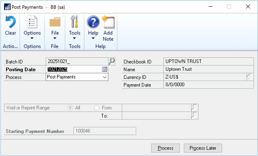 - If the original batch included payments for vendors either not enrolled or set to Local Processing, those payments will remain in the original batch and continue on to print from your local printer. The Post Payments window will automatically open, and you can post those payments immediately, or at a later time.