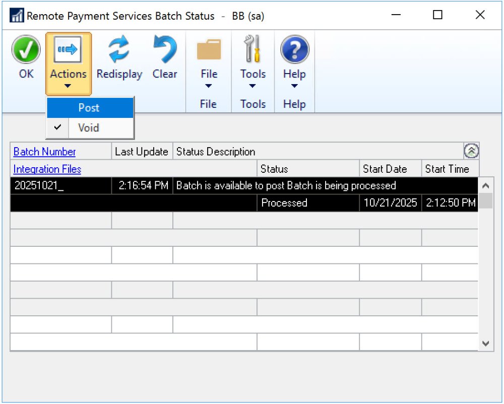 - Batches can be posted by highlighting each batch and clicking on the Actions menu > Post in the Remote Payment Services Check Status window.