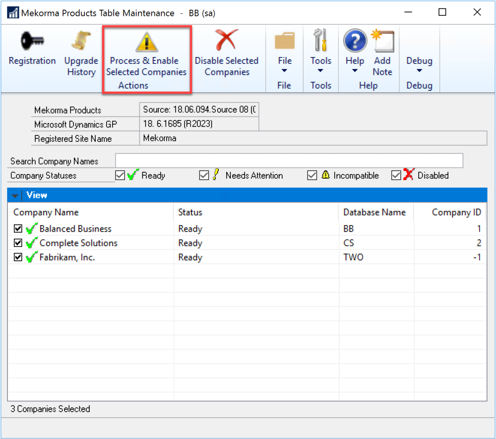 - Select the companies that need tables created or updated, and click Process & Enable Selected Companies. (You do not need to update all companies at the same time).