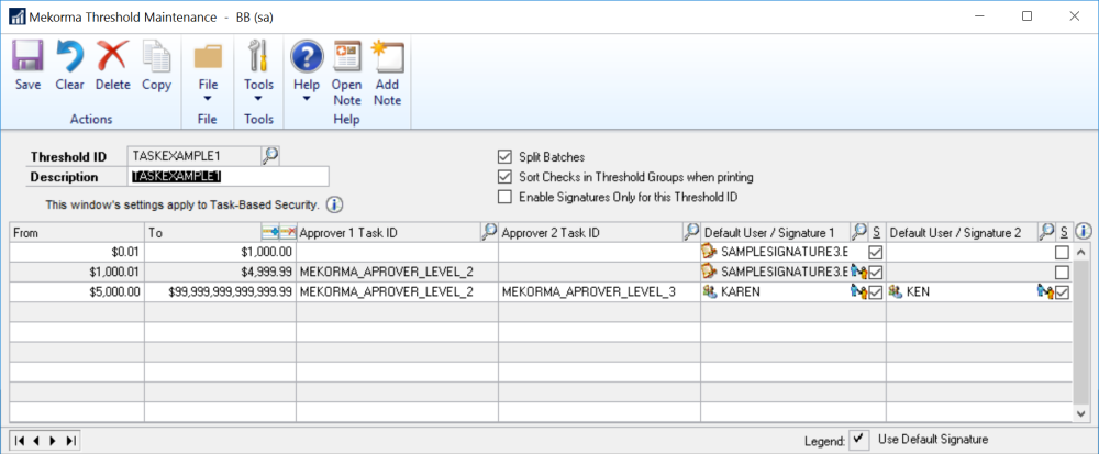 • Transactions in the third Threshold Level (from $5,000.00 to $999, 999, 999, 999, 999.99) are split into the next batch named “APBATCH_02.” This batch will need two people to approve, one with MEKORMA_APROVER_LEVEL_2 security access and one with MEKORMA_APROVER_LEVEL_3 security access before it can be processed.