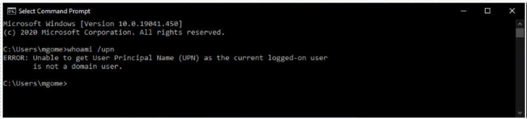 If you don’t know your UPN or are not a domain admin, open the command prompt on your machine and run the command whoami /upn. The result resembles an email address, but it’s the UPN on your local domain account.