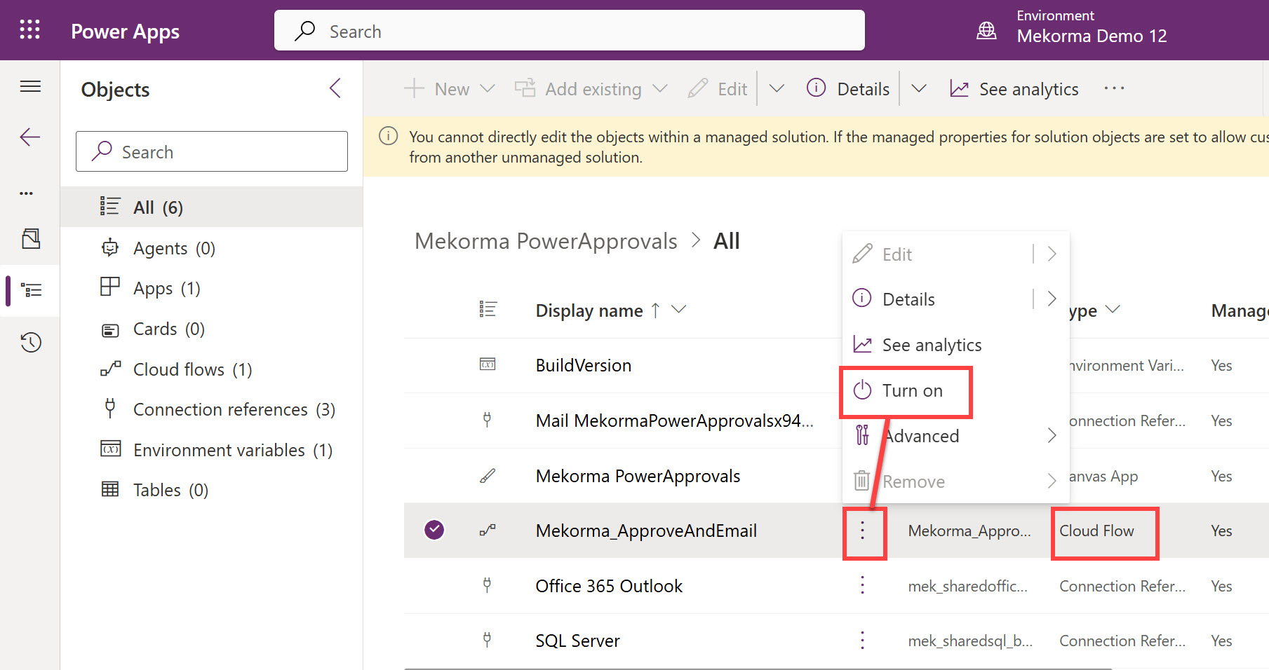 - Locate the Cloud Flow and click on the ellipsis (…). If the Flow is off, select Turn On. Wait a few seconds for it to finish. If the flow is already on, there is nothing to do.