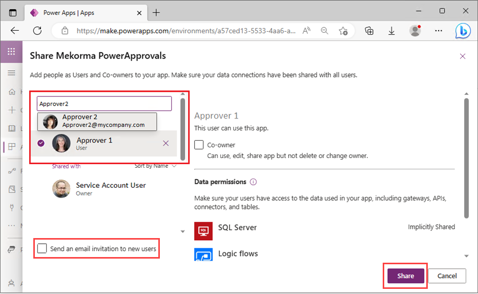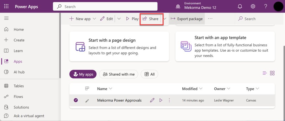 Before you can use Power Approvals, you must share Power Apps to approvers in your company. You can specify each user by name or specify a security group in Azure AD. Mekorma recommends setting up an Azure AD group for large groups of approvers for easy administration.